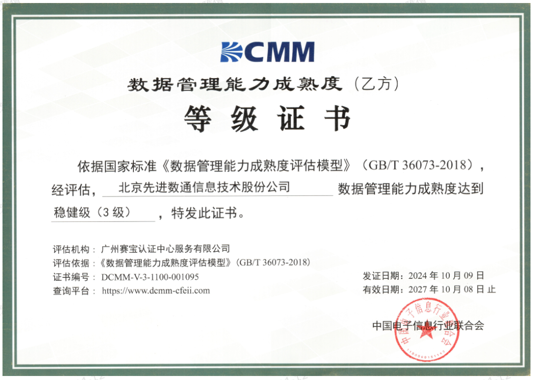 近期,中国电子信息行业联合会公布了最新一批顺利获得数据管理能力成熟度(DCMM)贯标等级认证的企业名单。公海gh555000aa 公海gh55成功取得数据管理能力成熟度稳健级(三级)认证。这一认证的取得,标志着公海gh555000aa 公海gh55在数据治理体系构建和数据管理与应用能力方面,已经达到了国家权威组织认可的标准。这不仅是对公海gh555000aa 公海gh55在数据管理领域专业能力的肯定,也是对其在有助于数字化转型服务和数据驱动决策方面所做努力的认可。